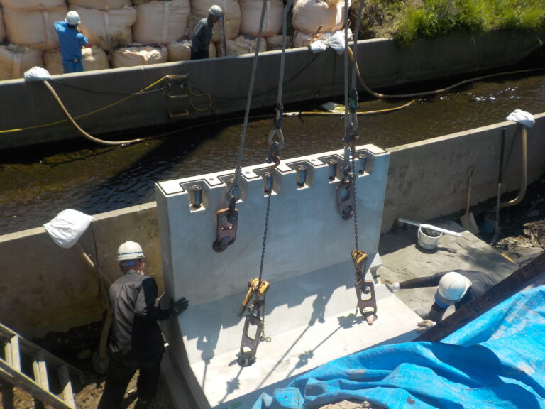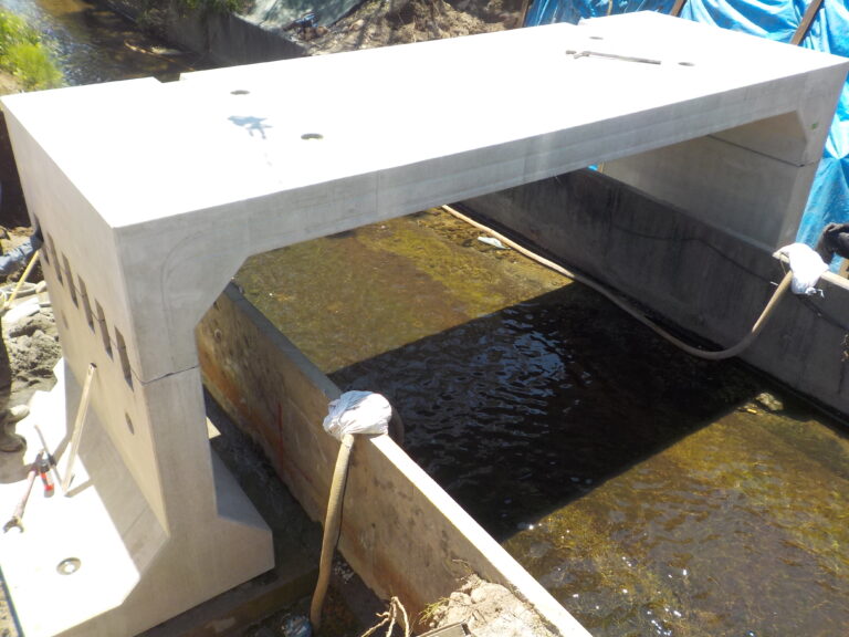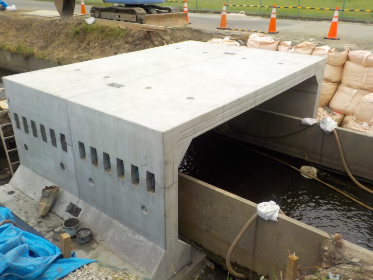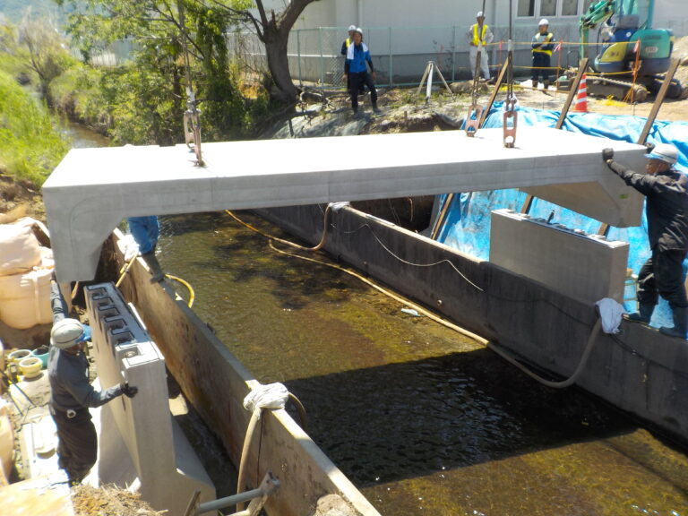 工事概要:既設の水路の先に建物を建てる事になり、床版とフリースパンの比較になりました。その結果、現場打ちの橋台を作るよりフリースパンの方が良いとなり施工しました。弊社のオリジナルのKTジョイントを使用している為、施工も容易で組付けも早く終わりました。