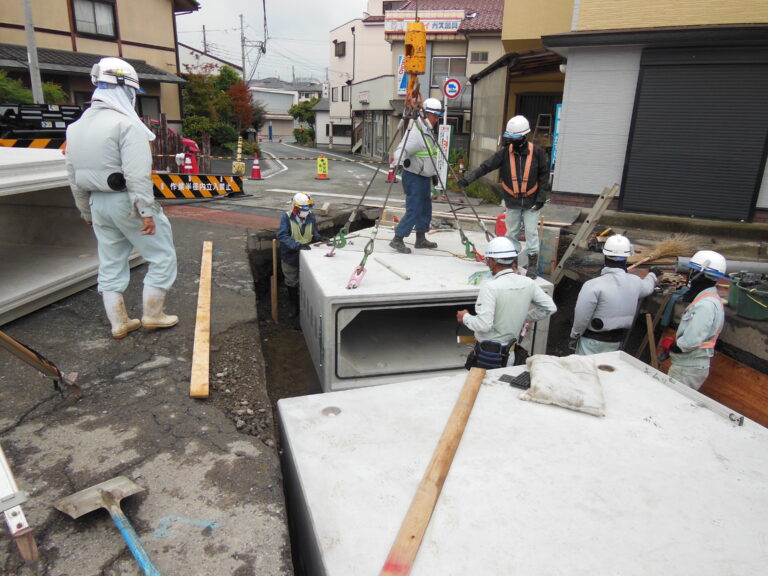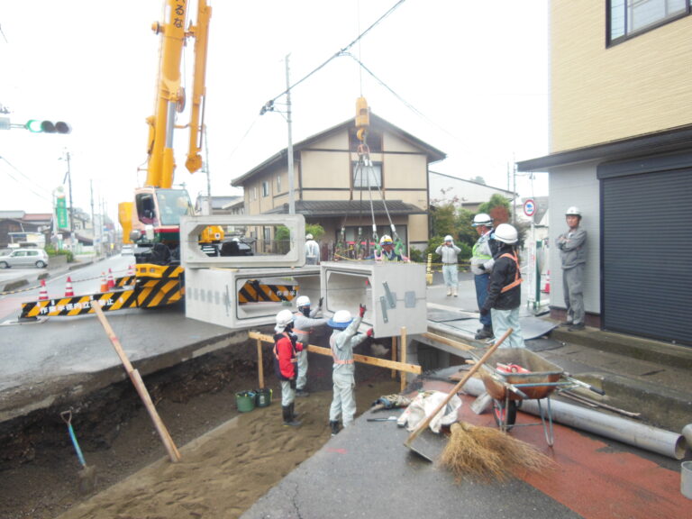 工事概要:ゲリラ豪雨対策で雨水を逃がす為の工事です。駅前交差点の為、即日復旧が求められました。基礎コンクリ-トを二次製品化して2日間で基礎コンクリ-トを据えて、翌2日間でボックスの施工をしました。