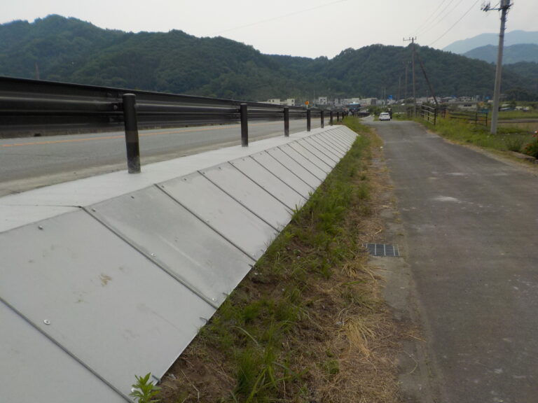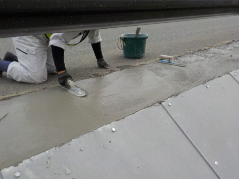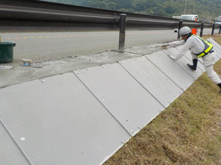 工事概要:材質はGRCです。人力で施工が出来ます。 天端は現場打ちコンクリートでの施工になりますので、ガードパイプの支柱をずらす 必要がありません。