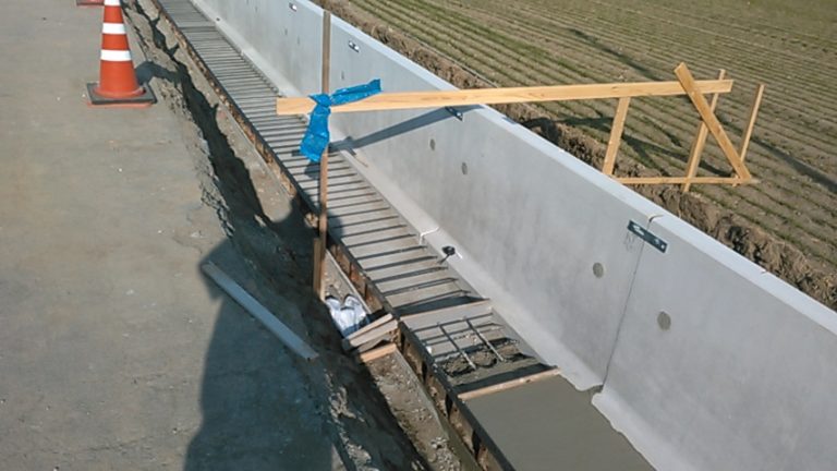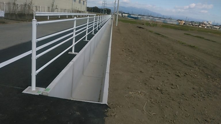 工事概要:老朽化した現場打ち水路の改修工事で片高式の擁壁付水路(TFC-CWF 片高式)が採用される 延長 L=200m 次年度継続工事有り