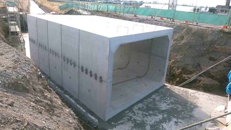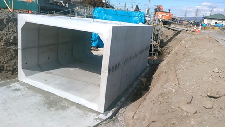 工事概要:用排水施設の整備工事における、老朽化した現場打ちボックスカルバートからの改修工事として、プレキャストボックスカルバートが採用される。