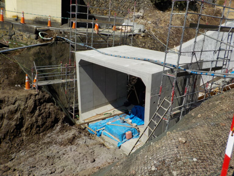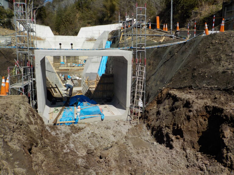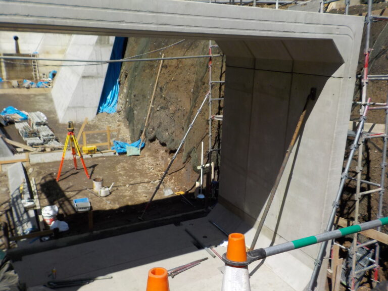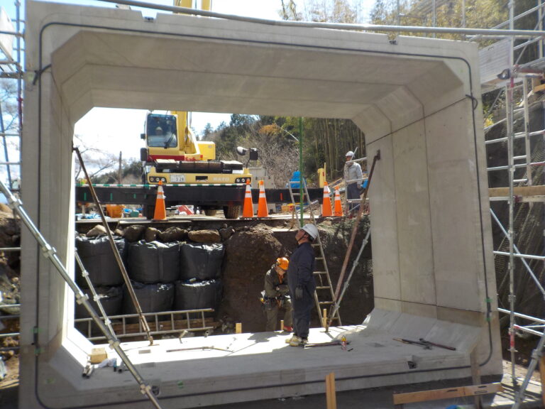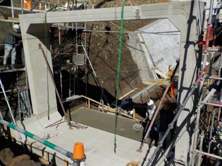 工事概要:BOXカルバ-ト KCVの幅5300、高さ3900、長さ1000の4分割の現場組付けになります。勾配10%の現場です。一番下流から施工せず、下流から2本目から施工して、問題なく終了しました。KTジョイント、縦断ジョイントなので出来る施工です。