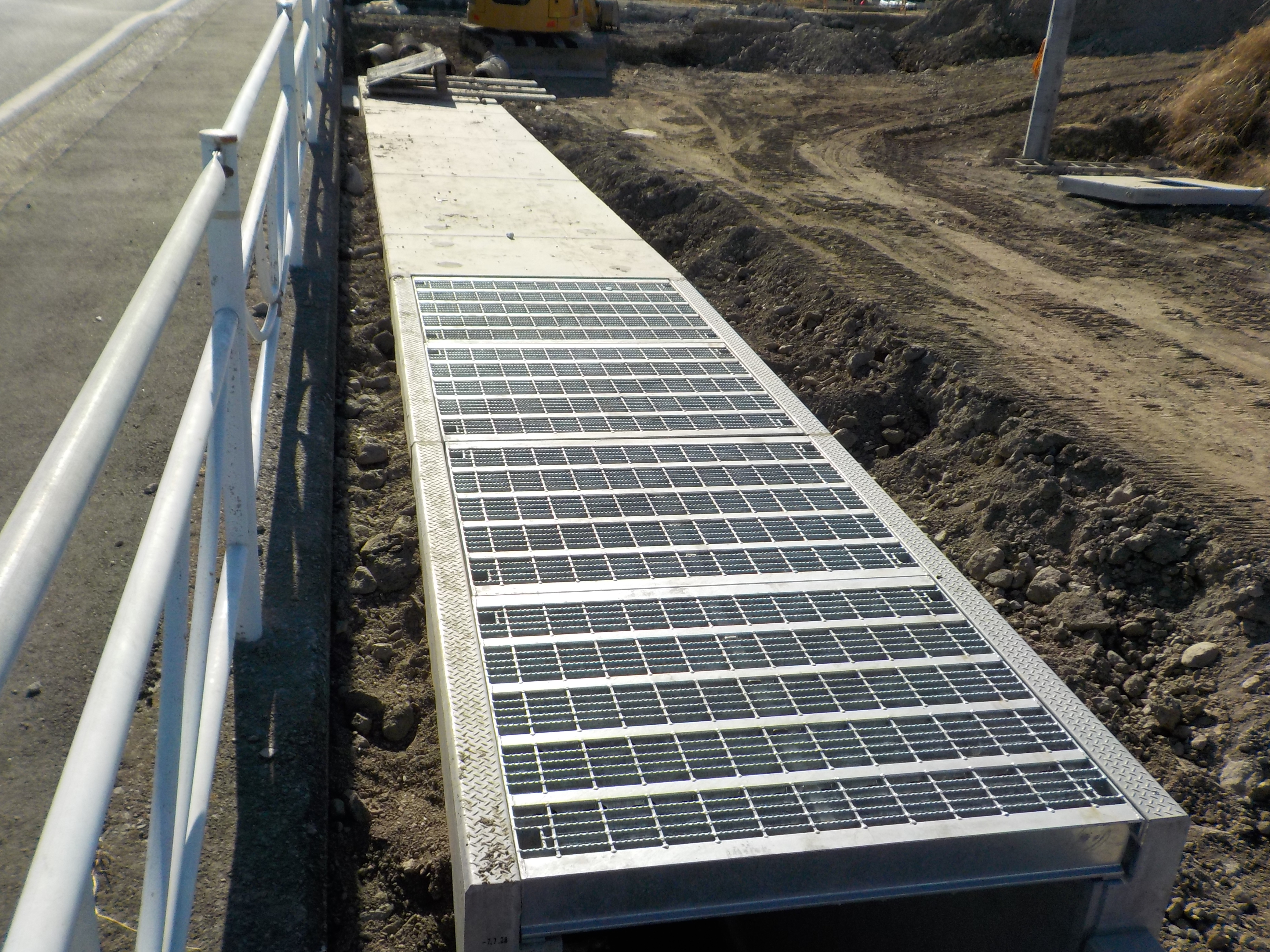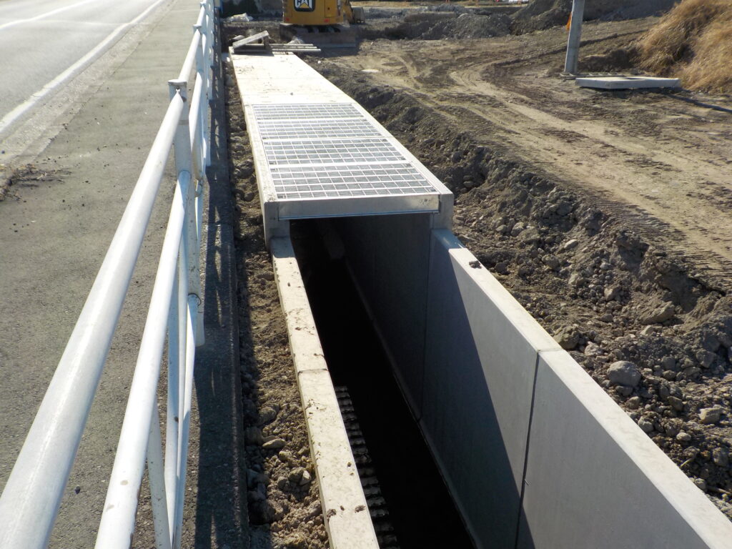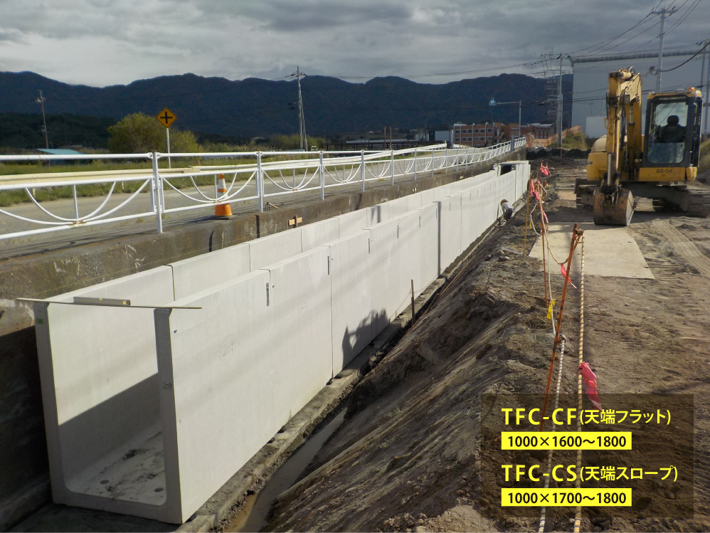 工事概要:当社の自在水路(TFC-CF、CS)天端フラット、勾配タイプ、      TFC-USG(勾配%)1100×2000×2000、BOXカルバ-ト(土被りゼロ)1100×2000×2000、短尺等を使用して頂きました。TFC-USGは大型のU型横断側溝(勾配2%)になります。