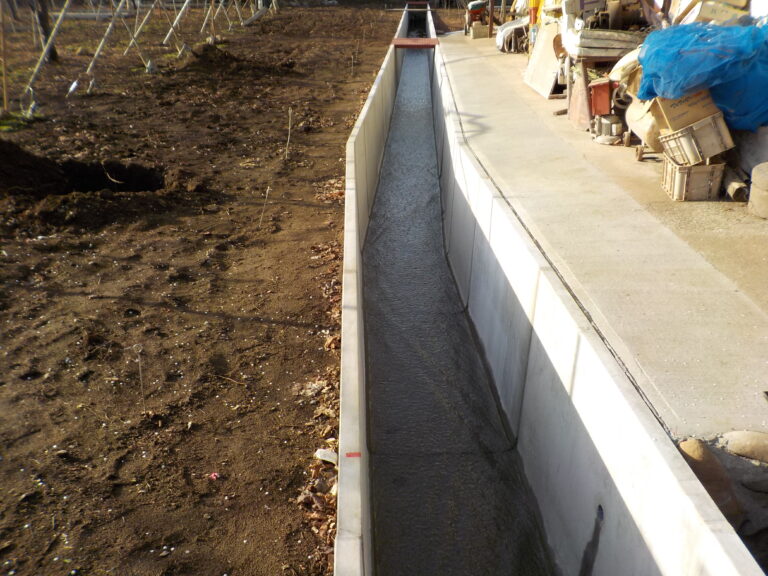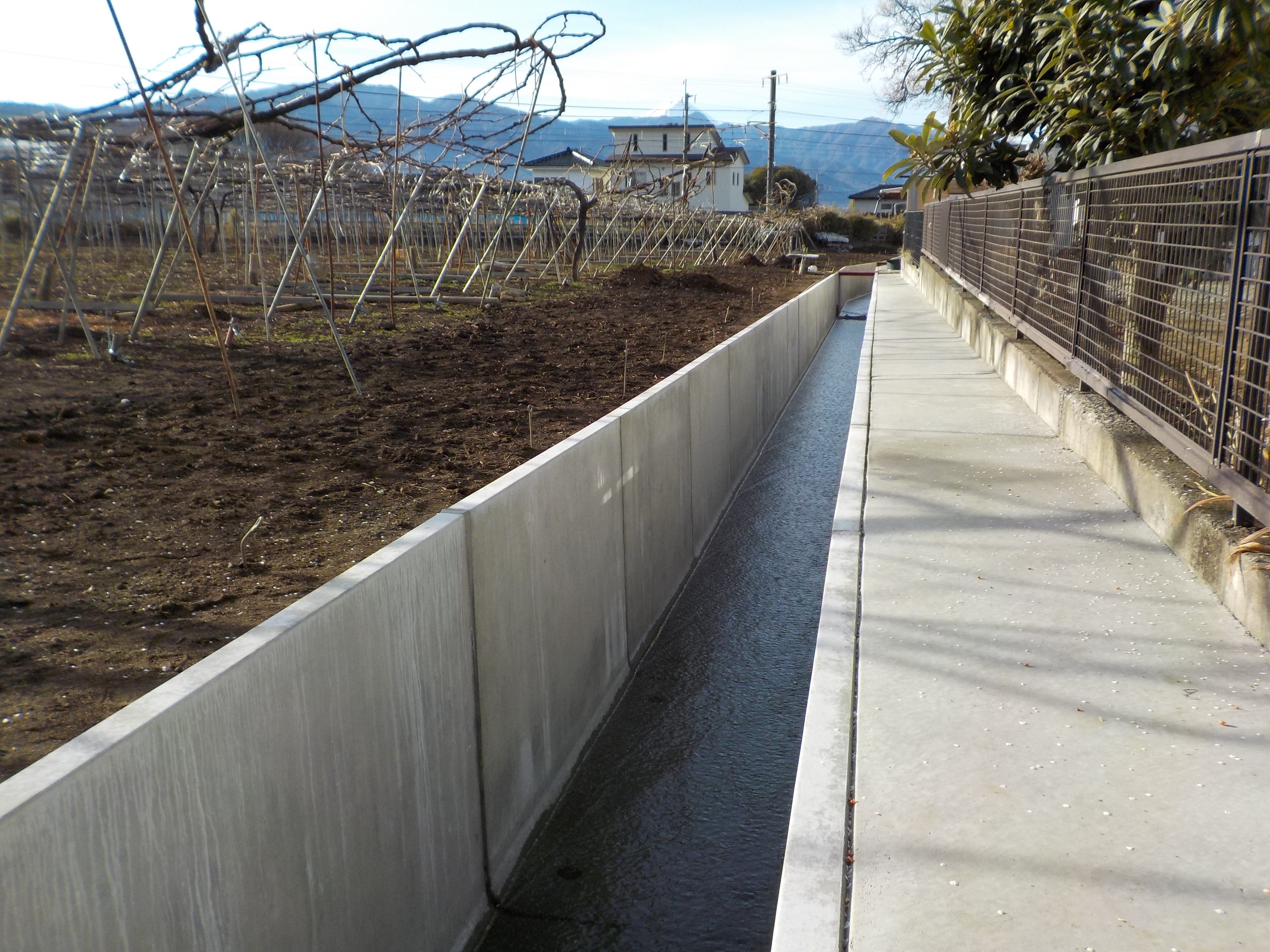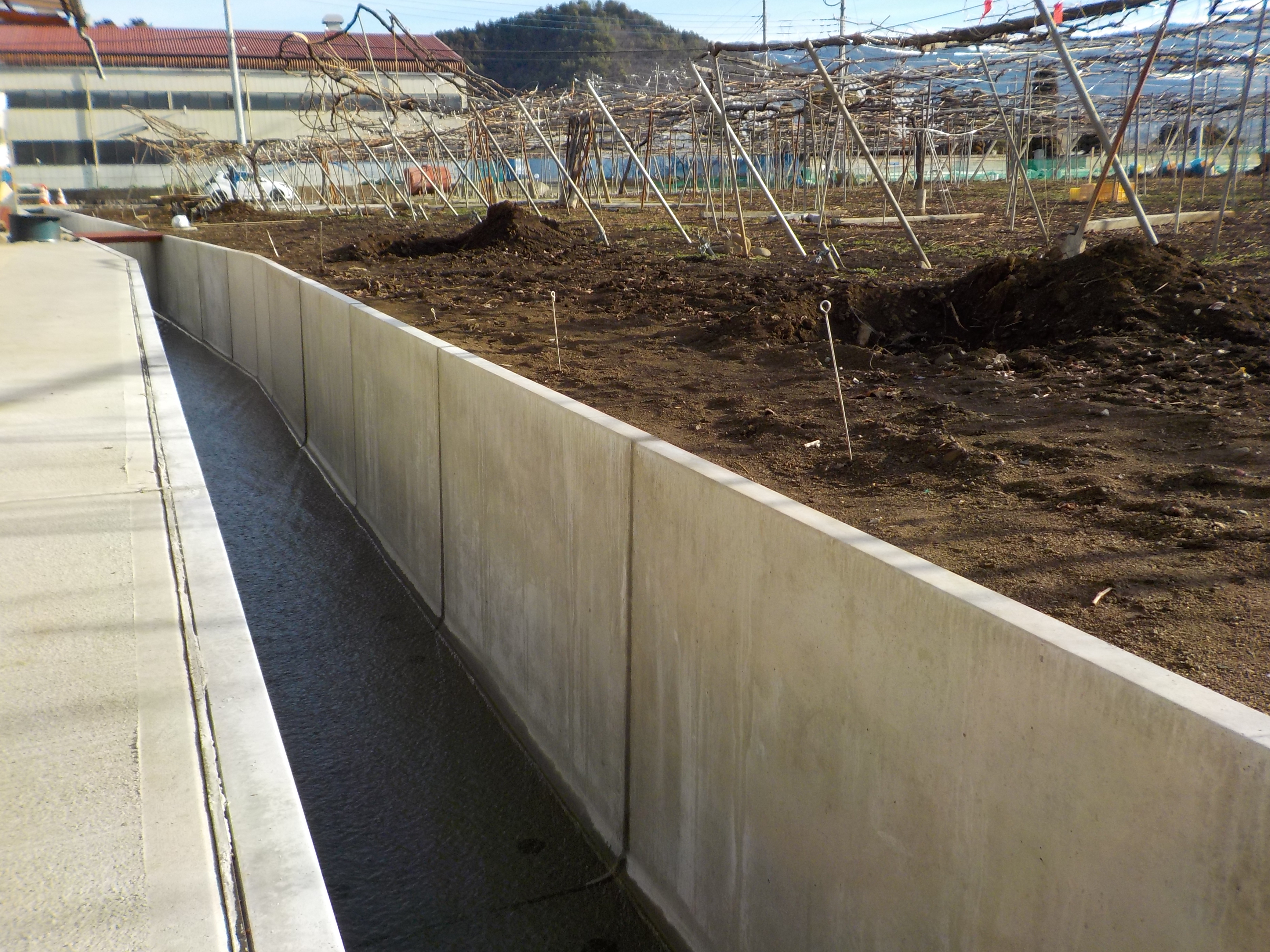 工事概要:シャインマスカット畑の中の水路改修工事になります。時期になれば、周りはシャインマスカットに囲まれます。