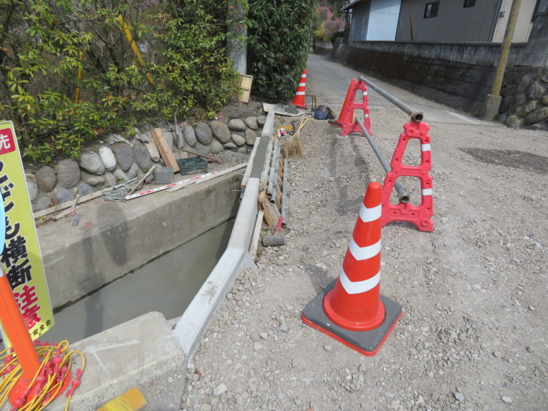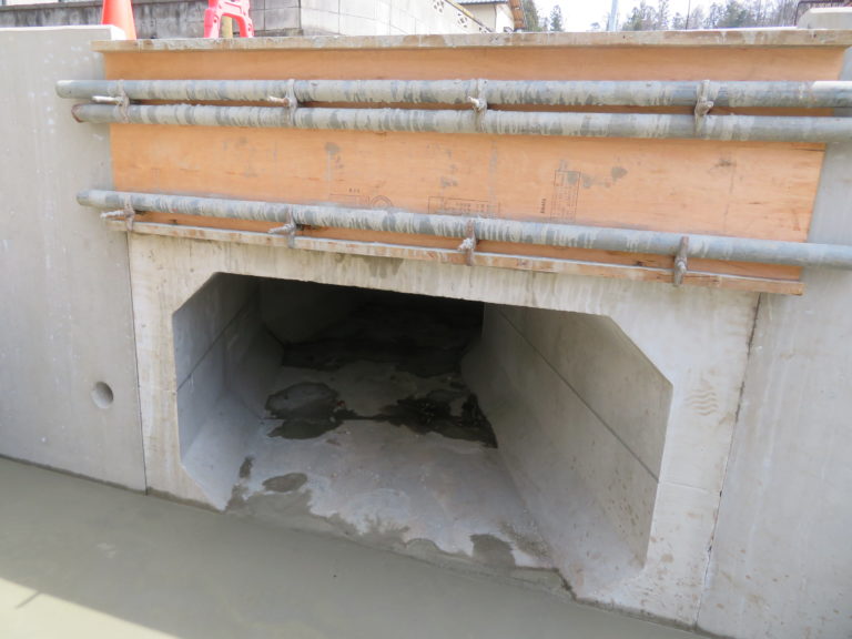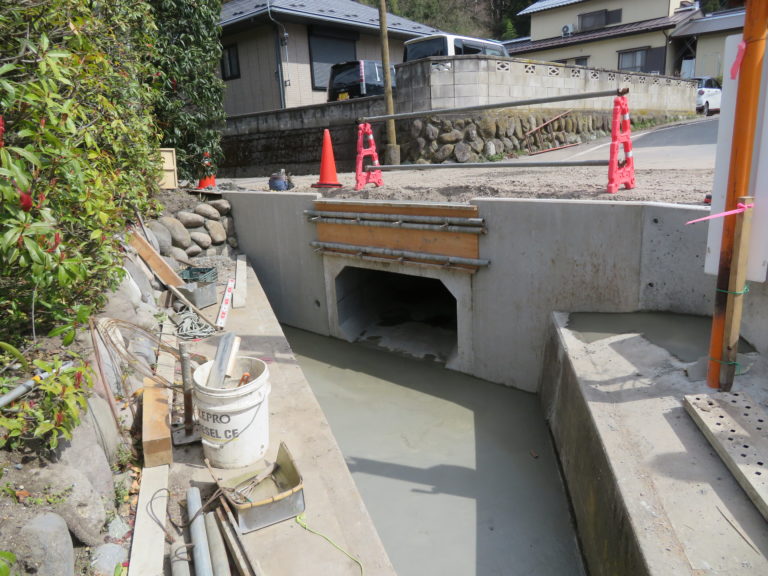 工事概要:老朽化している現場打ち暗渠を入れ替えると同時に道路部の拡幅をするという工事です。ボックスをプレキャストで対応することにより施工日数の短縮ができました。またウイング部もプレキャストL型擁壁を使用し道路の早期解放を実現しています。