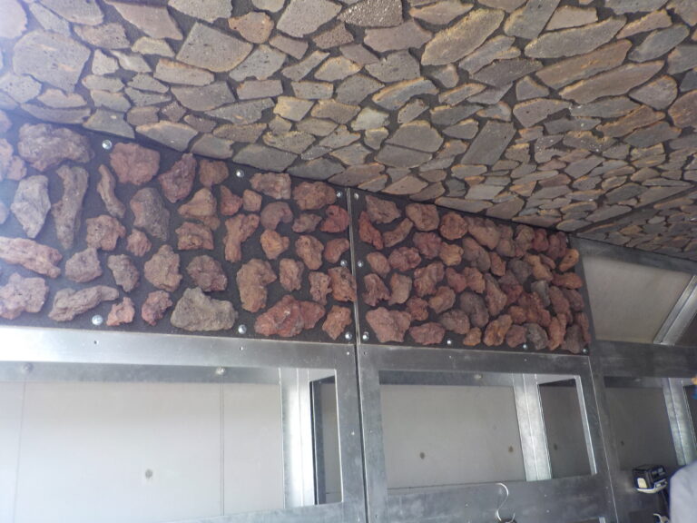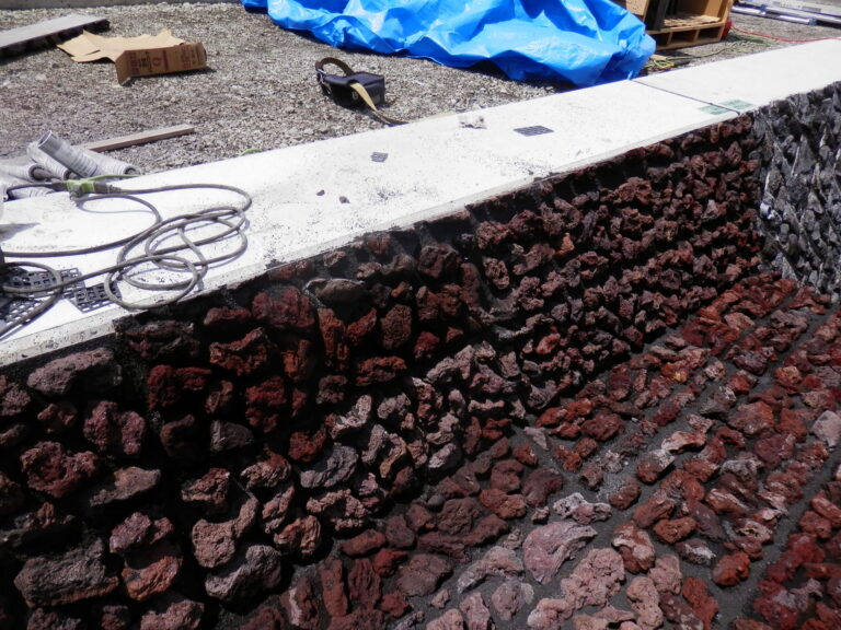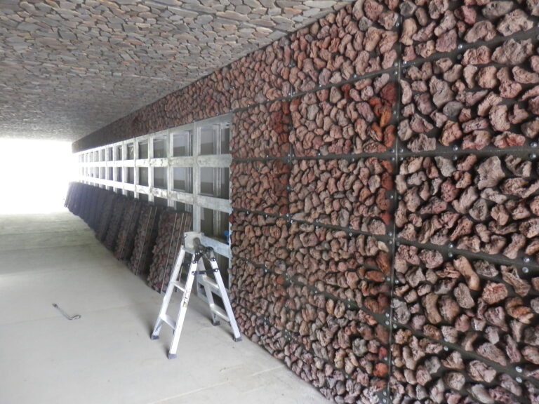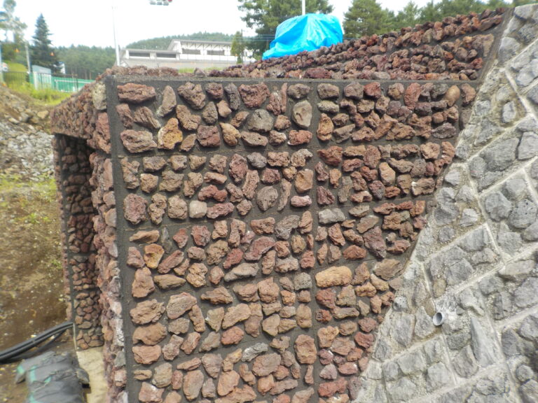 工事概要:昨年度施工の1工区のBOXカルバートKCV-4000×2500の中、外の前面にナチュロック ビオフィルム(大島溶岩)を貼り付けました。現状は周囲の色より赤が目立ちますが、経年劣化で徐々に黒ずんで馴染んで来ます。