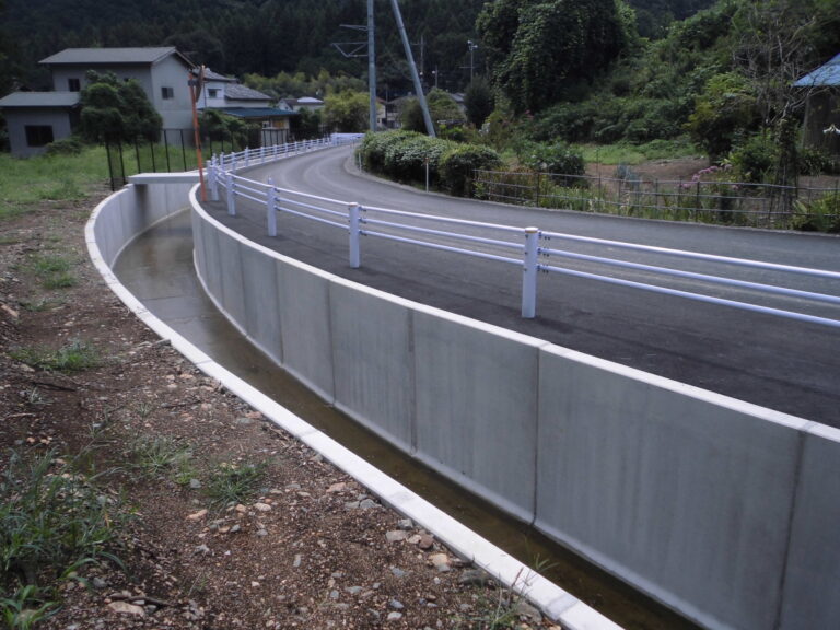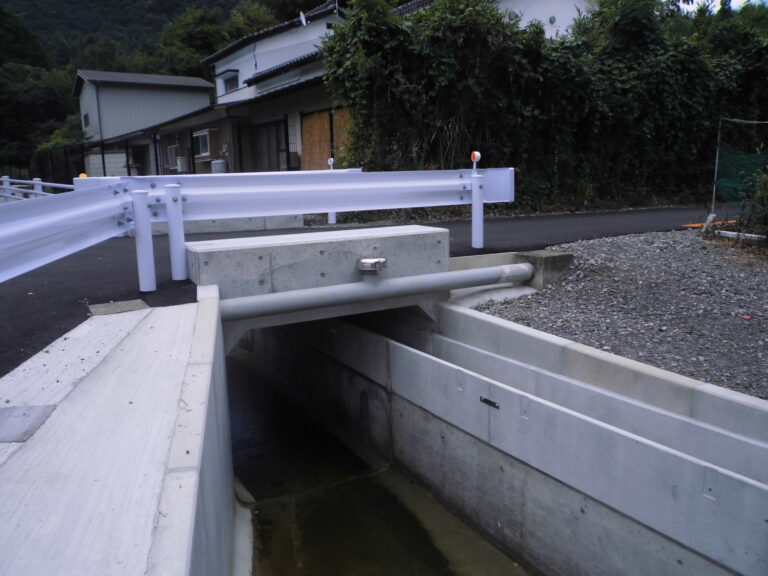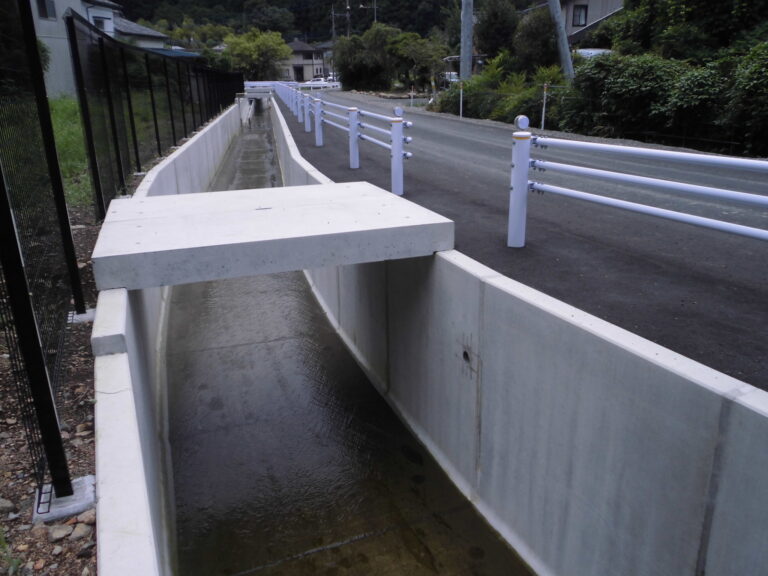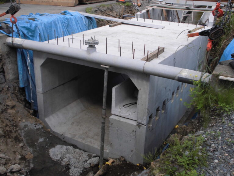 工事概要:小規模橋梁をボックスカルバートで施工。また、ボックスカルバート内部に取水口U型水路を設置するため上下2分割製品で納入しました。